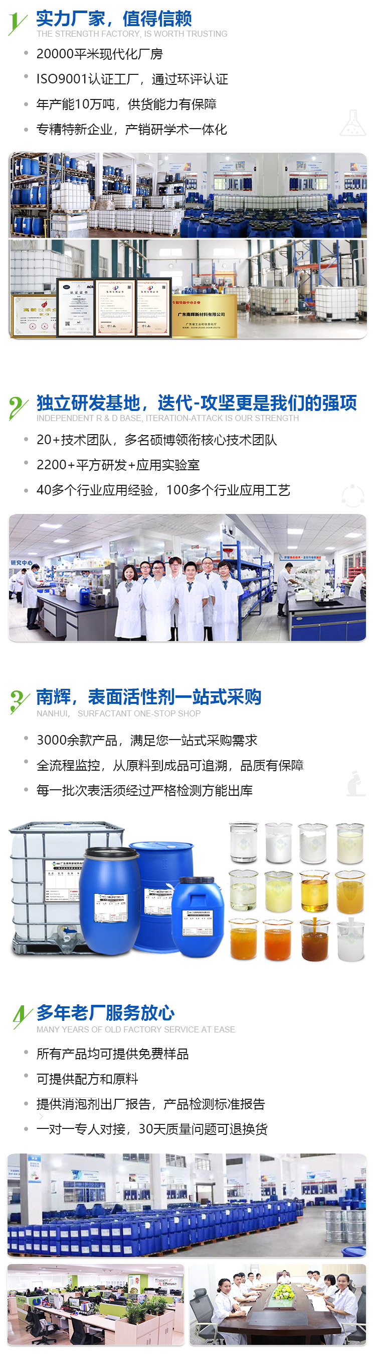 廣東南輝新材料有限公司,是一家致力于表面活性劑研發(fā)、生產(chǎn)、銷售為一體的國家高新技術(shù)企業(yè),擁有獨立的研發(fā)基地,主要研發(fā)產(chǎn)品有:乳化劑、滲透劑、勻染劑、司盤、吐溫、消泡劑等3000余款產(chǎn)品。南輝擁有20000平方米的現(xiàn)代化生產(chǎn)車間,年產(chǎn)能可達(dá)10萬噸。通過ISO9001:2015質(zhì)量管理體系認(rèn)證,已獲得十余項不同產(chǎn)品的發(fā)明專利授權(quán),被評為廣東省"專精特新"企業(yè)。從2018年開始批量出口至俄羅斯、日本、馬來西亞、印度、秘魯?shù)葒遥殉蔀閲鴥?nèi)目前主要的表面活性劑生產(chǎn)廠家。